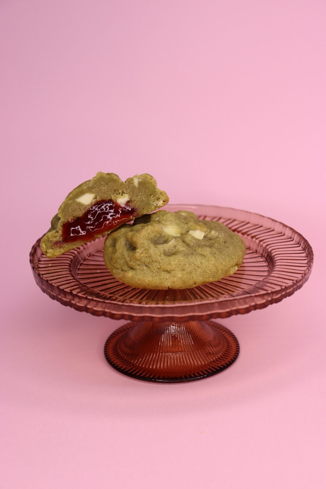Cookie cu pudra de Matcha, ciocolata alba si insertie de dulceata de capsuni.