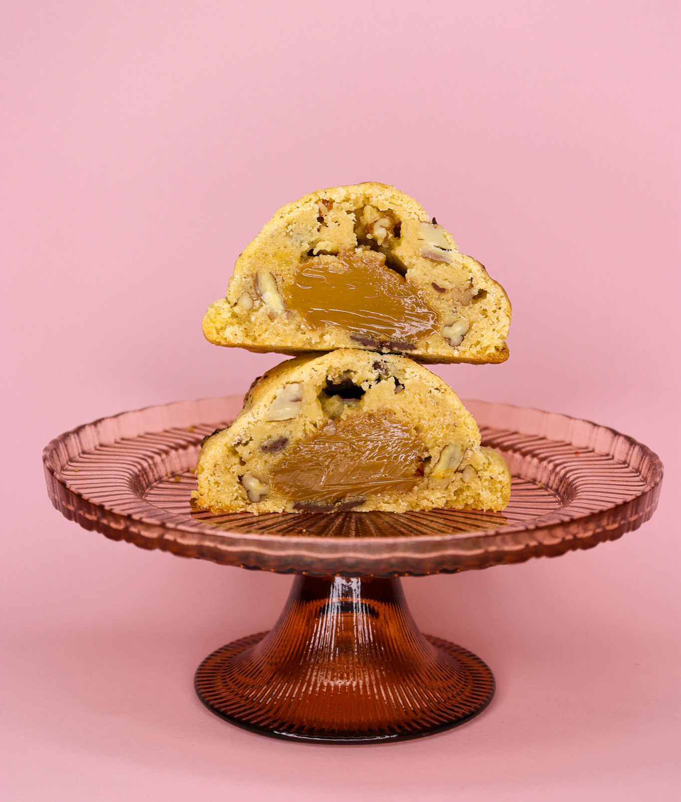Cookie de vanilie cu ciocolata neagra, nuci Pecan si insertie de Dulce de Leche.